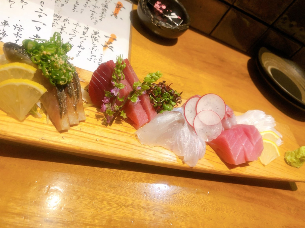 まずはお刺身盛り合わせから!どれも絶品で追加注文したいぐらいでした。